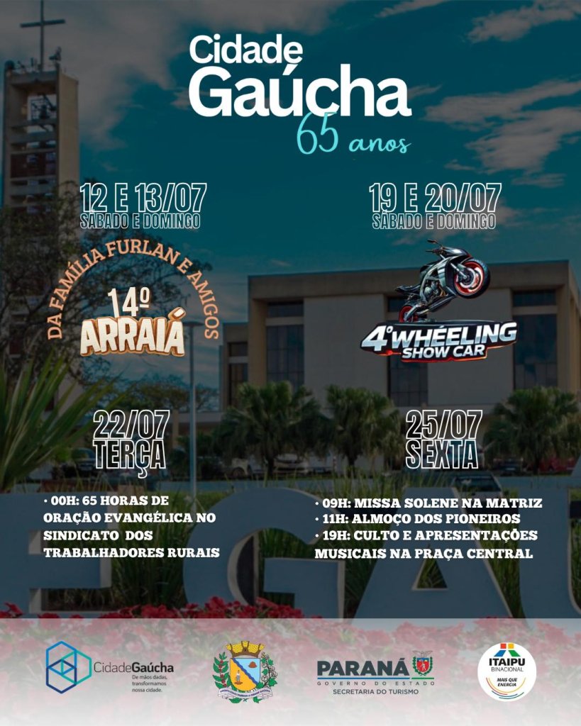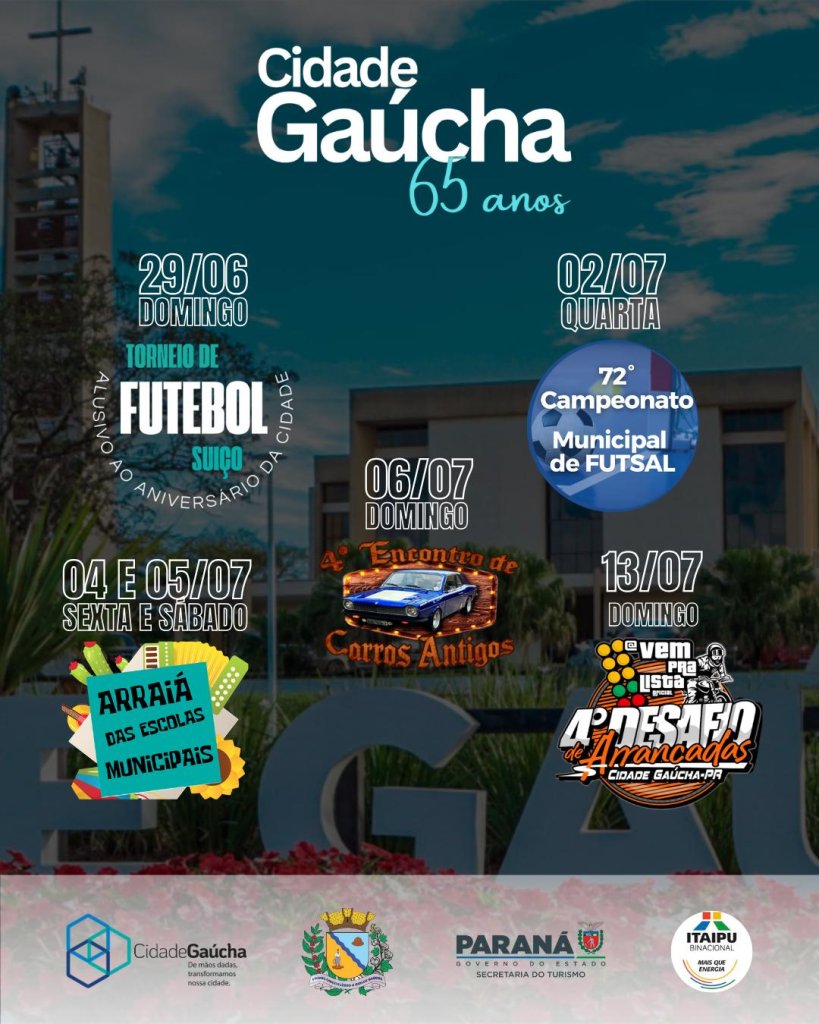 A Prefeitura Municipal, com o apoio do Governo do Estado do Paraná, da Itaipu Binacional — por meio do seu programa de patrocínios institucionais — e da Sanepar, convida toda a comunidade para participar desse momento de festa e orgulho para Cidade Gaúcha.